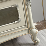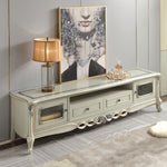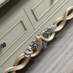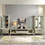 The Bernadette Entertainment TV Unit is a glamorous addition to any living room, with its light grey finish complemented by individually handcrafted ornaments in gold and silver accent. Storage is provided by two drawers, a top compartment and two side compartments featuring glass windows.