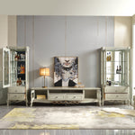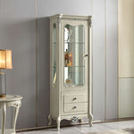 The Antoinette French Display Cabinet makes a stunning addition to any living room, with its light grey finish complemented by individually hand carved ornaments in gold and silver accent. Perfect for displaying your liquor or trophy collection, with storage provided by a combination of glass shelves and two bottom drawers. Subtle curves flow throughout with support provided by cabriole legs.
