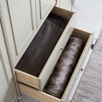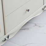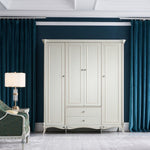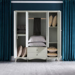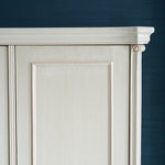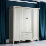 The Antoinette French Wardrobe Cabinet makes a grand addition to any bedroom, with its light grey finish complemented by individually hand carved ornaments in gold and silver accent. Perfect for keeping your wardrobe organised or general storage use, with storage provided by a combination of storage shelves, two bottom drawers and a clothes rack. Subtle curves flow throughout with support provided by cabriole legs.