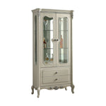The Antoinette Two Door French Display Cabinet makes a stunning addition to any living room, with its light grey finish complemented by individually hand carved ornaments in gold and silver accent. Perfect for displaying your liquor or trophy collection, with storage provided by a combination of glass shelves and two bottom drawers. Subtle curves flow throughout with support provided by cabriole legs.