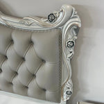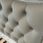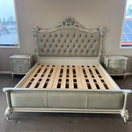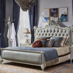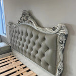 The Ariane French Bed is a luxury bed that makes an exquisite centrepiece in any bedroom. The handcrafted light grey frame is paired with a medium grey leather headboard and footboard featuring extensive ornaments in gold and silver accent. Subtle curves complement the towering wingback headboard with tufted buttons, which evokes a distinctly majestic feel. Available in King size only.