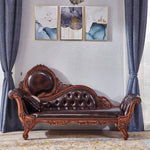 The Armand French Chaise Lounge makes an exquisite centrepiece in any living room or bedroom, with the handcrafted medium brown frame paired with dark purple leather padding and tufted buttons. Featuring exaggerated curves and intricate ornaments, this beautiful piece evokes a distinctly majestic feel and will bring a new level of sophistication to your home.