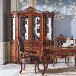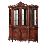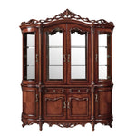 Store your wine and antiques in style with the Armand Half Round French Display Cabinet in medium brown. A solid Beech wood frame is paired with ornate finishes and intricate floral designs to produce this versatile French style cabinet. Storage is provided by a combination of glass display compartments and drawers. Subtle curves flow throughout with support provided by cabriole legs.