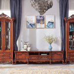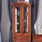 Store your wine and antiques in style with the Armand Two Door Display Cabinet in medium brown. A solid Beech wood frame is paired with ornate finishes and intricate floral designs to produce this versatile French style cabinet. Storage provided by a combination of glass shelves and twin drawers. Subtle curves flow throughout with support provided by cabriole legs.