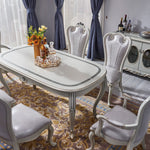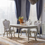 Entertain friends and family in style with the gorgeous Elaine French Dining Table in light grey finish with intricate floral ornaments in gold and silver accent. Perfect for any occasion, the table can comfortably seat five to six people. Quality wooden construction is supported by a graceful oval shape with cabriole legs. Pair with the Elaine French Dining Chair (sold separately) to create a dining room with flair.