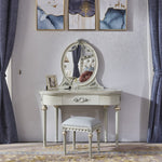 Inspired by 1930s Paris, the Elodie French Dressing Table features soft curves that bestow it with a classic feel and will leave you feeling extra special every time you get ready. The light grey finish is combined with intricate ornaments in gold and silver accents to produce an understated yet glamorous look, making this piece perfect for displaying your jewellery and antiques. Pair with the Elodie Vanity Stool (sold separately) to create a bedroom with flair.