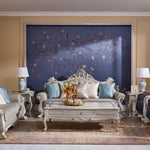 The Gabrielle French Armchair is a stunning addition to any living room or bedroom, featuring a handcrafted light grey frame paired with dark blue fabric padding and a patterned finish. The curved back provides maximum comfort while maintaining an elegant look. Pair with the Elodie French Side Table (sold separately) for a spectacular combination.